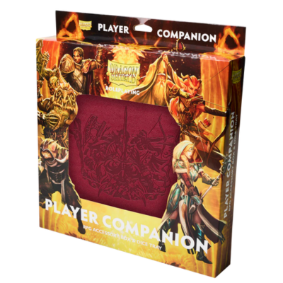 The Dragon Shield Player Companion is a two-in-one storage box and gameplay area for players of tabletop RPGs. Use the Player Companion to pack dice, miniatures, pens/pencils, character sheets and an RPG book or two! Take everything you need to go dungeon delving in one handy companion. The Player Companion doubles as your play area, fold it out and roll dice in the dice tray for a satisfying sounding roll. Place your character sheet under the overlay and use the included dry erase marker to track HP, inspiration or death saves without marking your character sheet directly. You can easily wipe clean and re-write on the overlay. Do you use digital character sheets on a mobile phone or tablet? Use the included foam blocks and place it in the miniature compartment to rest at the perfect viewing angle while playing. The Companion can be folded if table space is tight. The Player Companion features a tough Dragon Skin exterior, making the companion a durable piece of adventuring gear. Dragon Shield Roleplaying accessories are designed to enhance gameplay and immersion for Game Masters and Players of tabletop RPGs! Included in the box: Dry erase marker Dragon Shield mini-adventure Features: Room for miniatures, pens and dice Doubles as a dice tray Tough Dragon Skin exterior Clear overlay sheet and included dry erase marker makes tracking hit points easy Strong, magnetic lock ensures safe transport and storage of contents Deluxe duchess satin lining Holds a smart phone or iPad Space for RPG books Dice and RPG books not included.