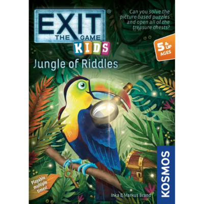 Either working alone or in teams, in each round of Exit: The Game – Kids: Jungle of Riddles players are presented with a different type of puzzle, which are shown on 36 large-format picture cards that are combined in new ways. Answer the riddles to open treasure chests.