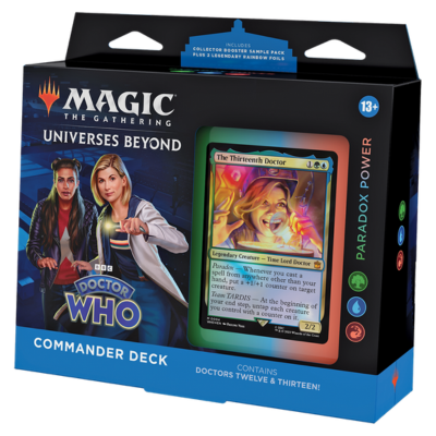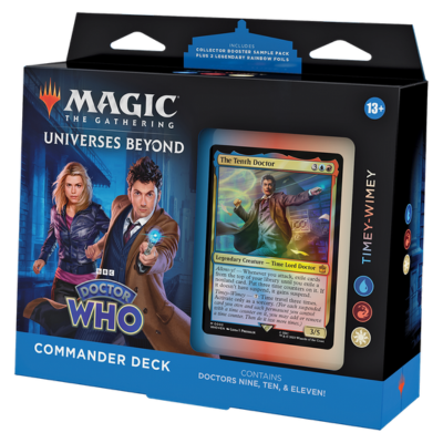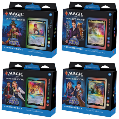 In Commander, four players come together to show their strength and strategy, with one player coming out on top. Each 100-card ready-to-play Magic: The Gathering Universes Beyond: Doctor Who™ Commander Deck makes it easy for Commander fans in your store to grab a deck and play right away.