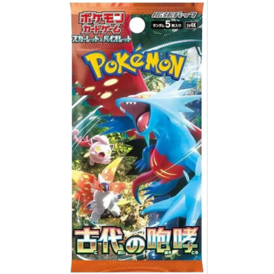 Booster pack from SV4K Ancient Roar (Japanese only), each booster pack contains 5 Pokemon trading cards.